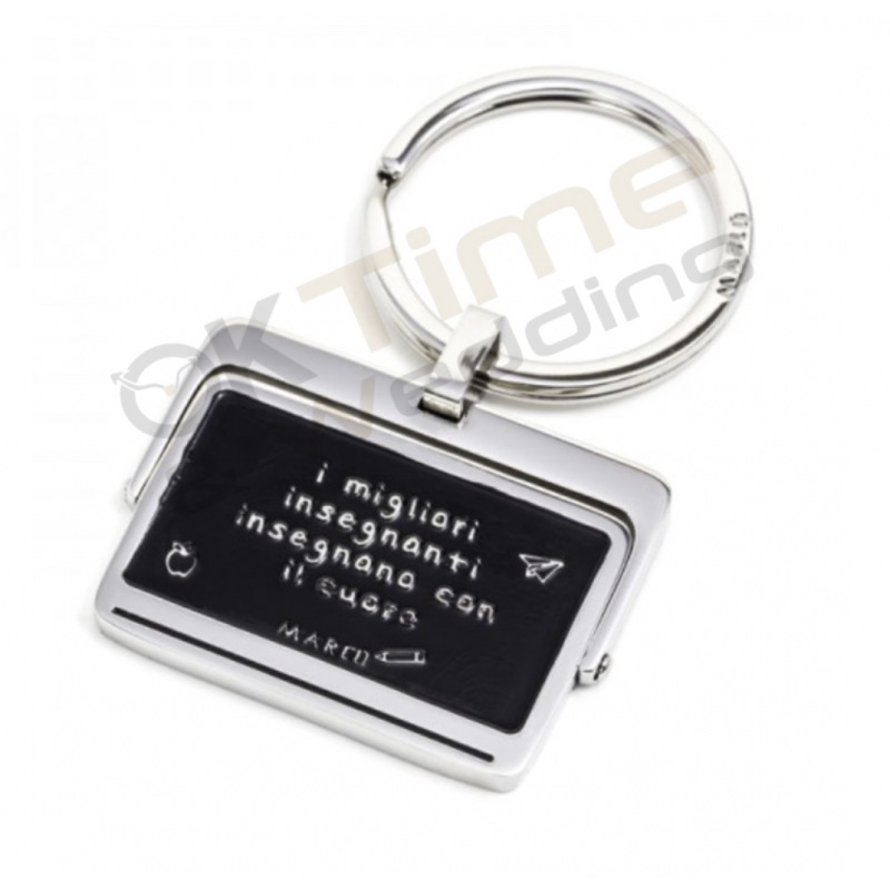 Portachiavi in acciaio con lavagna girevole. Sul fronte la scritta “Best teacher” sul retro “I migliori insegnanti insegnano con il cuore” Collezione: Nel Mio Cuore 20Materiali: Acciaio, smalto